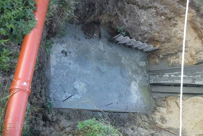 После окончания копки, нужно залить поверхность бетоном. Необязательно брать тяжелые марки, но желательно, чтобы они были водостойкими. Слой должен быть ровным. В него нужно вмонтировать дополнительные петли для крепления конструкции.