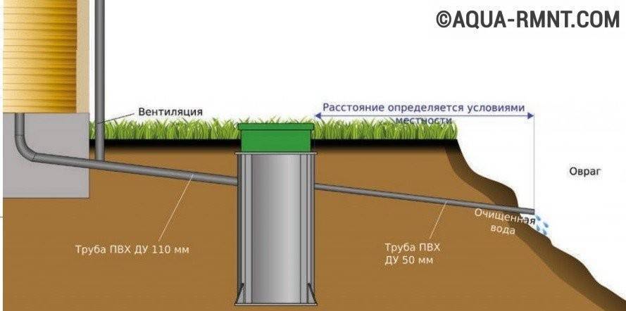 Если вблизи загородного участка находится овраг, проблем с установкой слива не будет: достаточно проложить отводящую трубу выходом прямо на склон оврага