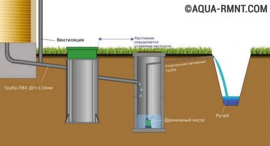 Один из лучших вариантов — слив в ручей. Он подразумевает прокладку отводящих труб с контруклоном не менее 2-4 см/м
