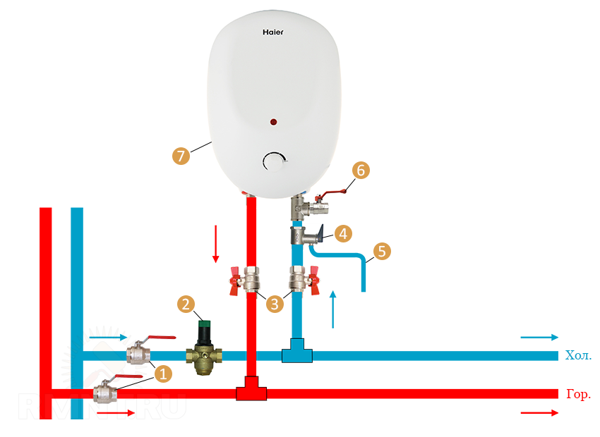 На выходе из бойлера горячей воды и на входе холодной, сразу после обратного клапана, нужно установить краны, перекрывающие эту линию в период, когда водонагреватель не работает. После кранов трубопроводы через гибкие сантехнические шланги или жёсткие стальные или пластиковые трубы нужно соединить с отводами от тройников на магистралях.