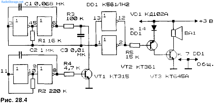 Рис. 4. Принципиальная схема сирены на микросхеме K561ЛH2.