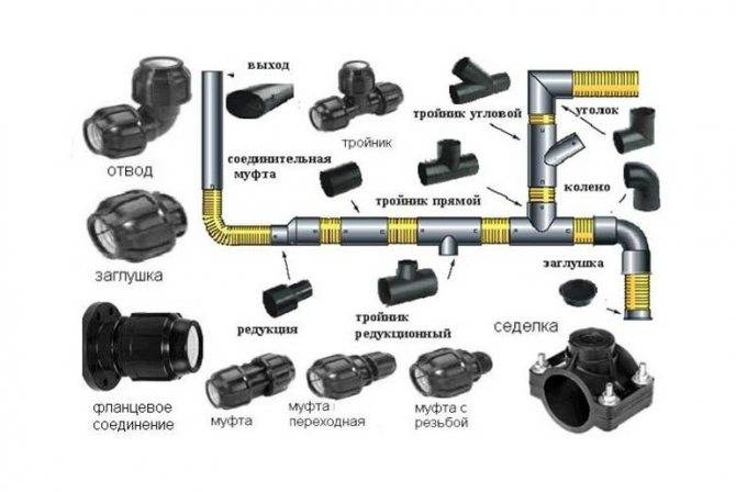 Соединение труб ПНД можно проводить с использованием специальных фитингов. Такие конструкции применяют при создании коммуникаций из труб малого диаметра (до 50 мм). При этом можно использовать следующие типы фитингов: