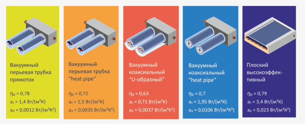 В самом простом исполнении солнечный коллектор называется плоским. Он выполняется в виде бокса из стекла с темным покрытием, которое находится в контакте с проходящим по трубкам теплоносителем. Более сложное устройство имеют вакуумные коллекторы. В таких батареях трубки с теплоносителем помещены в герметичный стеклянный корпус, из которого откачивается воздух. Таким образом, содержащие рабочую среду трубки окружаются вакуумом, который исключает потери тепла от контакта с воздухом.