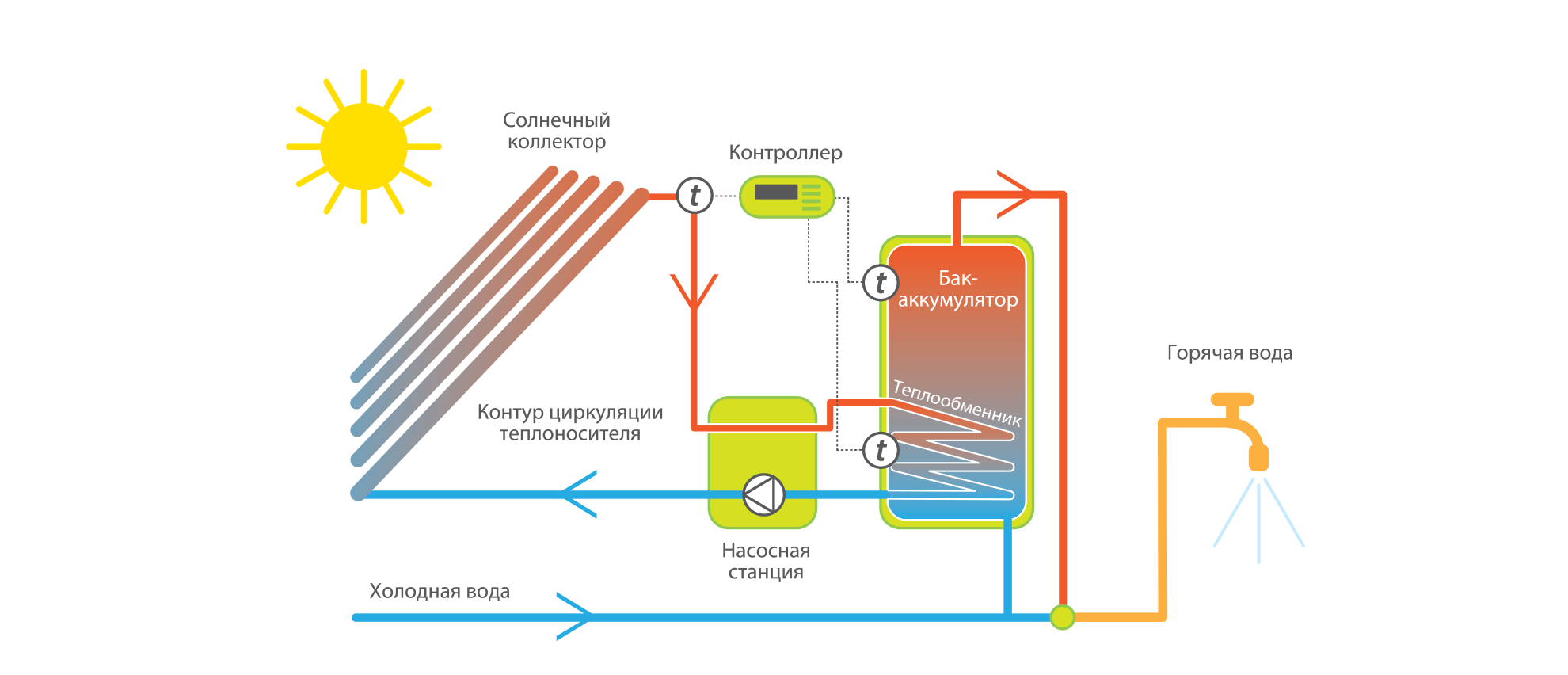 Принцип работы солнечного водонагревателя Функционирует эта система следующим образом: