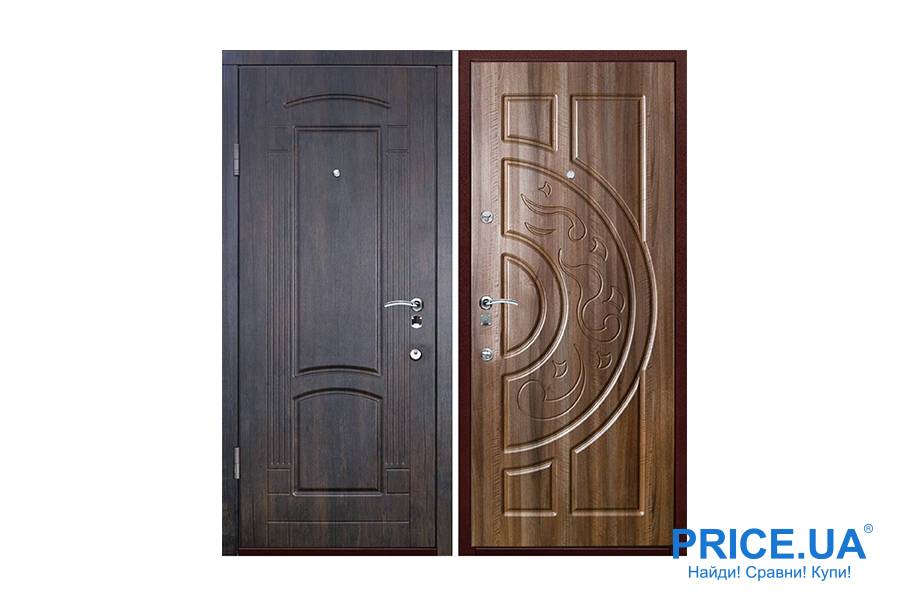 МДФ-накладки. Такие плиты устойчивы к воздействию влаги и перепадам температуры. Часто используются с другими декоративными элементами типа витражей, мозаики, ковки. Отличаются хорошими тепло- и звукоизоляционными свойствами. Варианты дизайна (фрезеровок) – сотни рисунков на любой вкус. Внешне металлические двери с МДФ-покрытием очень похожи на добротные натуральные деревянные, но стоят на порядок ниже.
