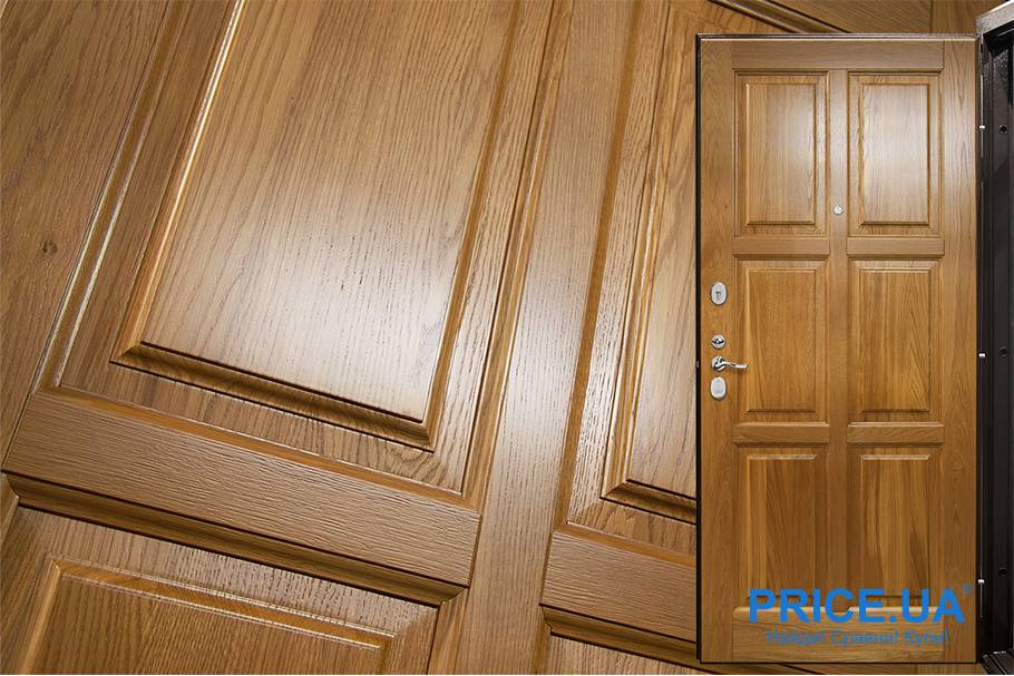 Натуральное дерево. Чаще всего используются деревянные панели из дуба, бука, сосны или ясеня. А используя морилку, даже блеклую на вид сосну можно превратить в точное подобие красного дерева. Результат – прочные, очень красивые двери, устойчивые к агрессивному воздействию внешней среды. Недостаток – защитный лаковый слой на древесине периодически нужно будет обновлять, иначе она начнет впитывать влагу, разбухать и рассыхаться, теряя и эстетические и защитные свойства. Панели из натурального дерева – презентабельный внешне, но самый дорогой материал.