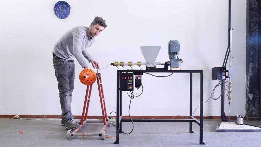 - Экструзия. Применяют простой по строению аппарат. Принцип его действия аналогичен промышленному экструдеру, но создается такой станок в домашних условиях. В этом случае переработанное сырье на выходе превращается в гранулы или нити.
