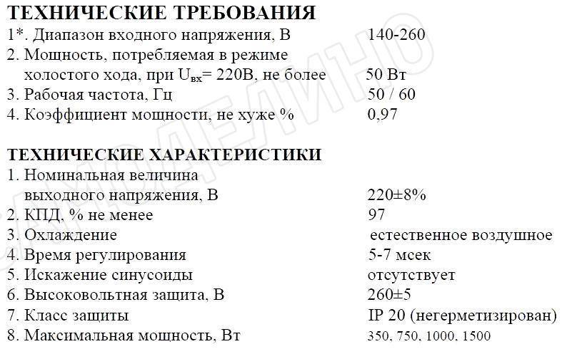 Наиболее верная стратегия — приобрести аппарат известной марки, не соблазняясь меньшей ценой нового производителя. При этом модели российского производства ЭНЕРГИЯ, ШТИЛЬ, БАСТИОН ничуть не уступают по качеству IEK, LUXEON и латвийской РЕСАНТА. Для примера приводим паспортные данные стабилизаторов напряжения РЕСАНТА.