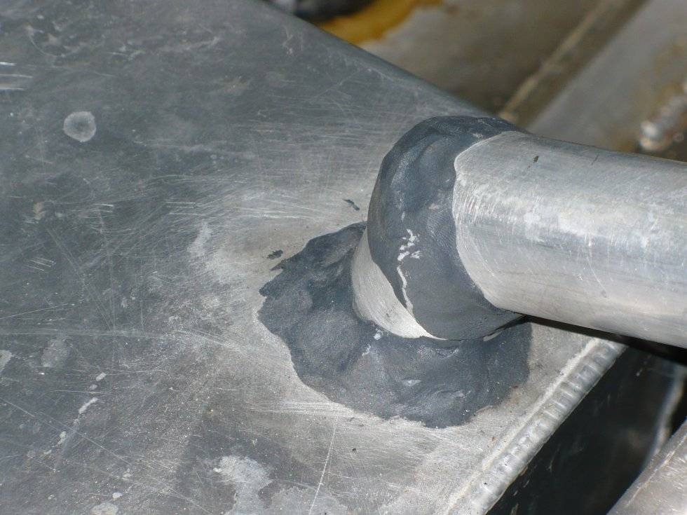 Для ликвидации течи, образовавшейся в сварном шве, можно воспользоваться аварийным клеем или самодельным хомутом. Как использовать указанные средства, рассказано ранее.