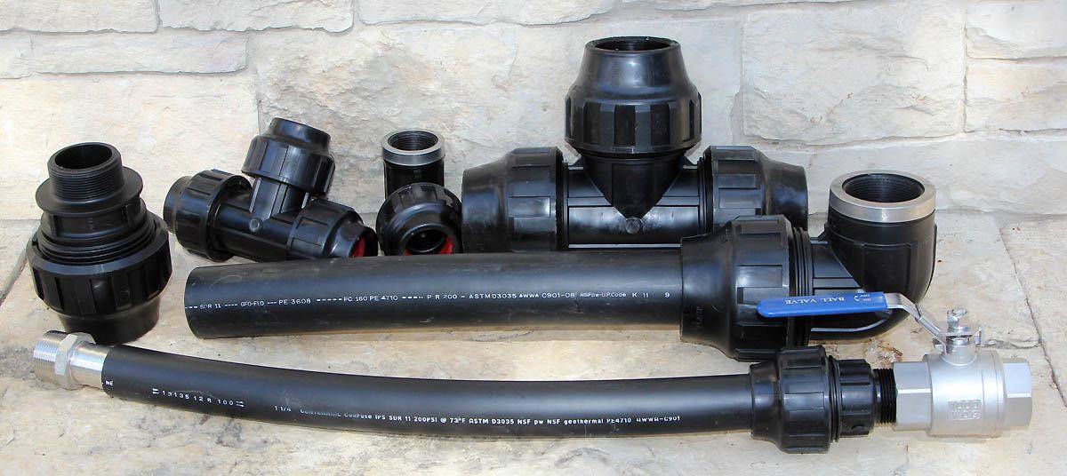 - Методом использования компрессионных фитингов. Существует огромное разнообразие соединительных элементов, при помощи которых можно собрать трубопровод любой степени сложности. Недостатком такого способа является его периодическое обслуживание. Таким образом, помещать его в грунт не рекомендуется. Однако, его можно при необходимости разобрать и собрать в другой конструкции.