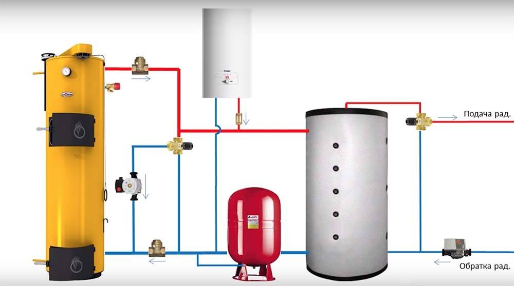 Лучше всего использовать схему включения с подмешиванием или гидроразвязкой. Используются трехходовые клапаны с термостатом. Теплоаккумулятор при этом устанавливается как отдельный элемент системы, параллельно контуру отопления.