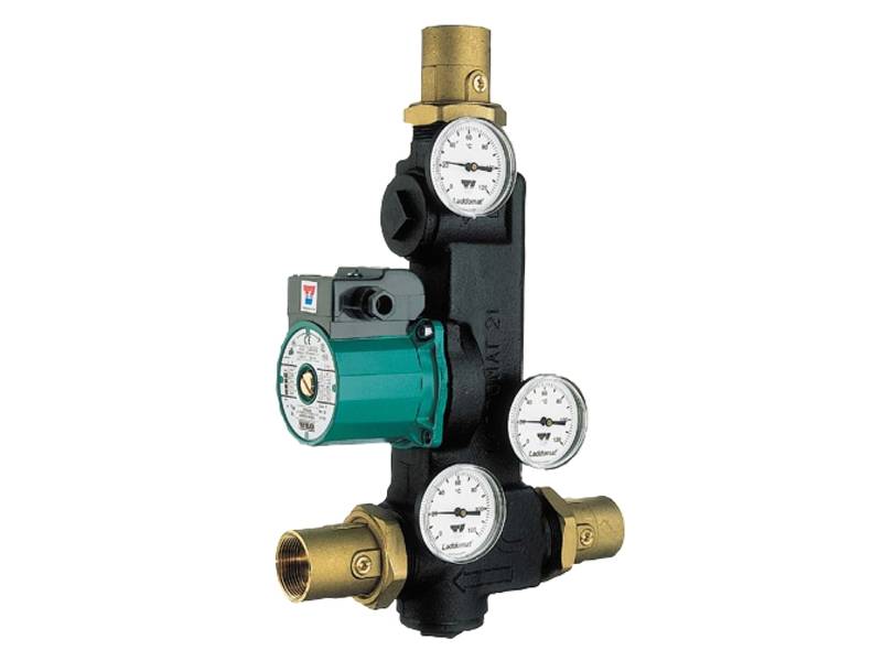 Использовать можно несколько трехходовых клапанов на раздаче и на обратке и группу термостатов. Как вариант, в продаже имеются готовые сборки для подключения теплоаккумуляторов – блок автоматического подмешивания, например LADDOMAT.
