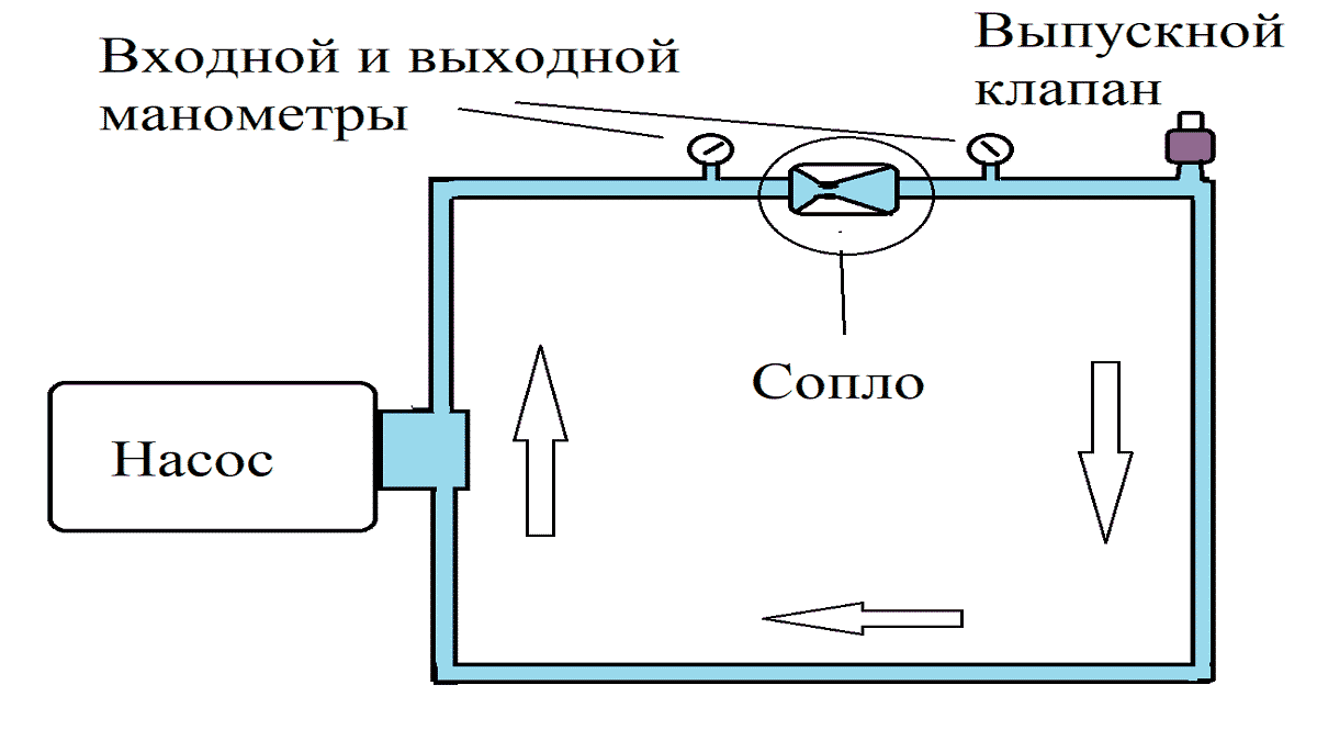 Конструкция представляет собой изогнутую трубу, которая присоединяется к выходу камеры, далее рабочая среда снова подается на вход.Субстанцияв контур поступает по направлению против часовой стрелки. Контур снабжается двумя манометрами и парой гильз с термометрами. Модель дополняет вентиль для сбора воздуха. Для регулирования давления вентиль устанавливается между входом и выходом.
