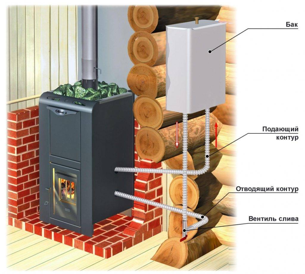 - Емкость непосредственно в парилке — позволяет воде быстрее греться, т. к. водопровод отсутствует или очень короткий. Сокращаются и теплопотери. Недостаток вполне очевиден: полезная площадь парилки сокращается.