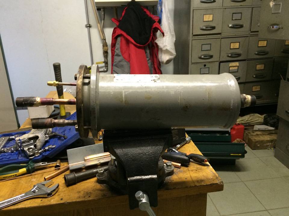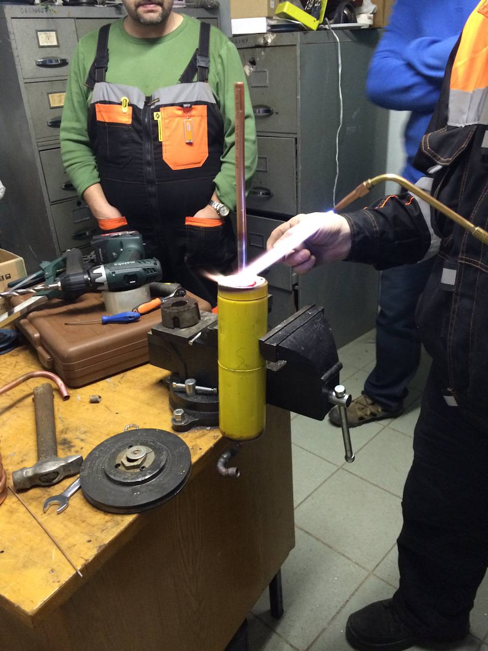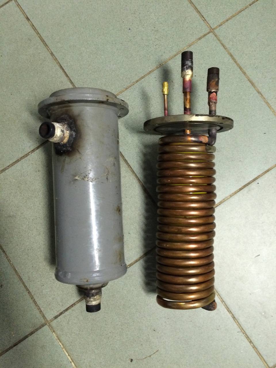 - Самое сложное при выполнении такого теплообменника — согнуть трубу в виде спирали, не уменьшив ее сечения. Медные трубы диаметром меньше 28 мм можно согнуть с помощью трубогиба без нагрева. Стальные и алюминиевые, а также трубы большего диаметра перед формовкой необходимо разогреть паяльной лампой.