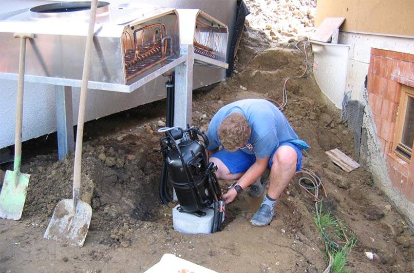 Монтаж ТН такого типа похож на установку кондиционера по своему принципу. Нужно разместить наружный блок с испарителем на улице и внутренний – в помещении. Между собой они связаны медной трубкой с термоизоляцией, по которой проходит хладагент ( фреон ).