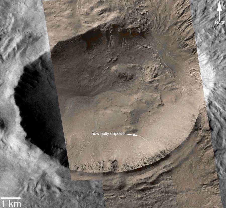 Ученые обнаружили на Марсе массивные ледники. Лед также имеется в полярных шапках. Кроме того, были обнаружены следы, оставленные жидкой водой на поверхности планеты. Это самое очевидное доказательство того, что на поверхности все еще периодически появляется вода, хотя некоторые продолжают считать появление этих следов результатом движения пыли или замерзания углекислого газа. Почва Марса содержит гидроксиды железа, что тоже может свидетельствовать о присутствии воды.