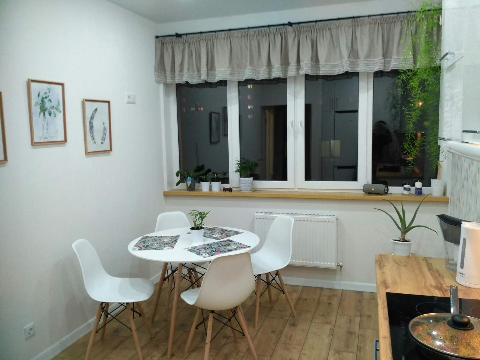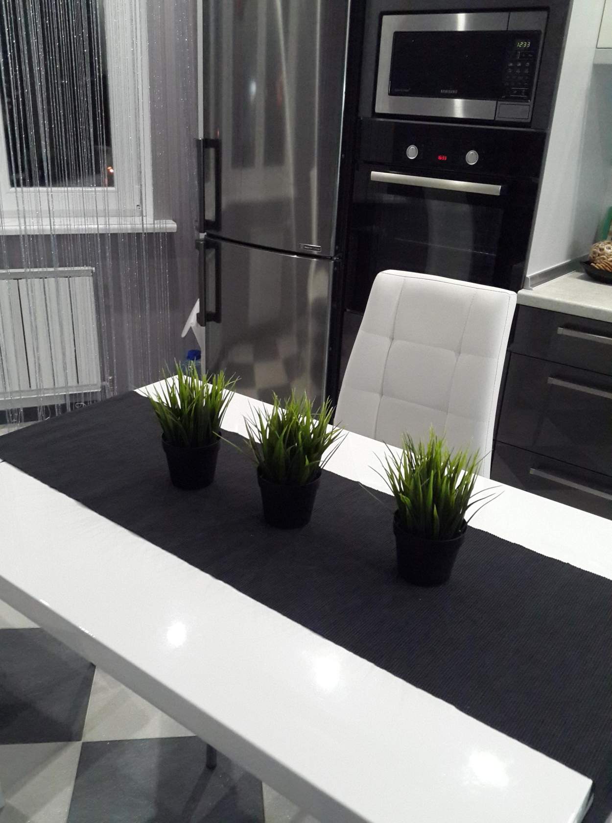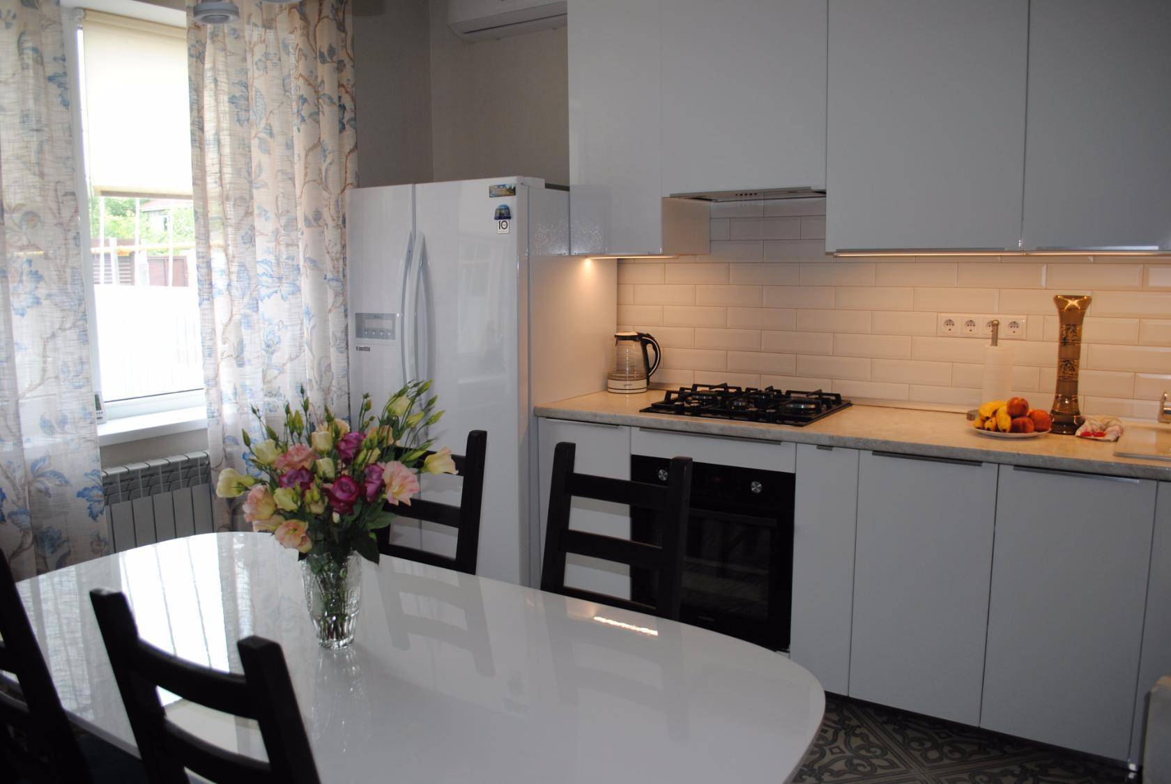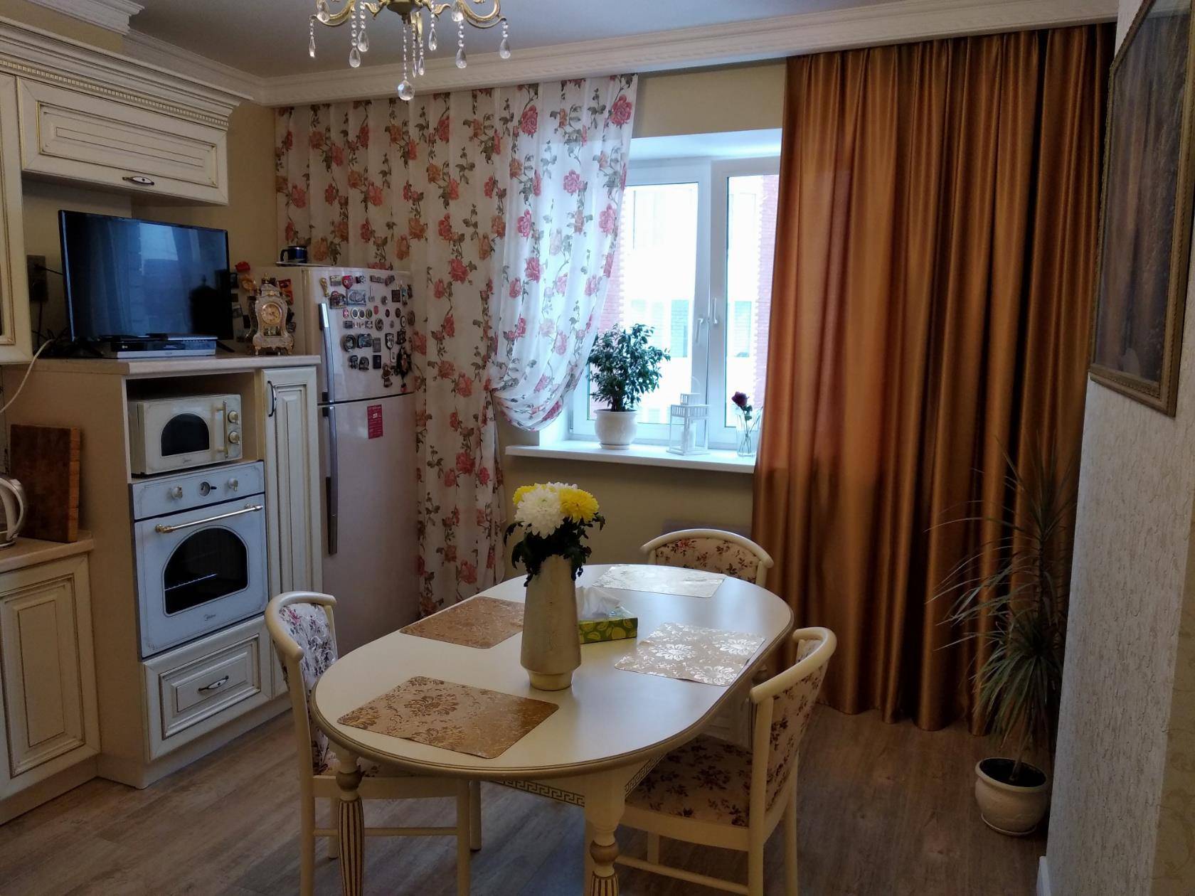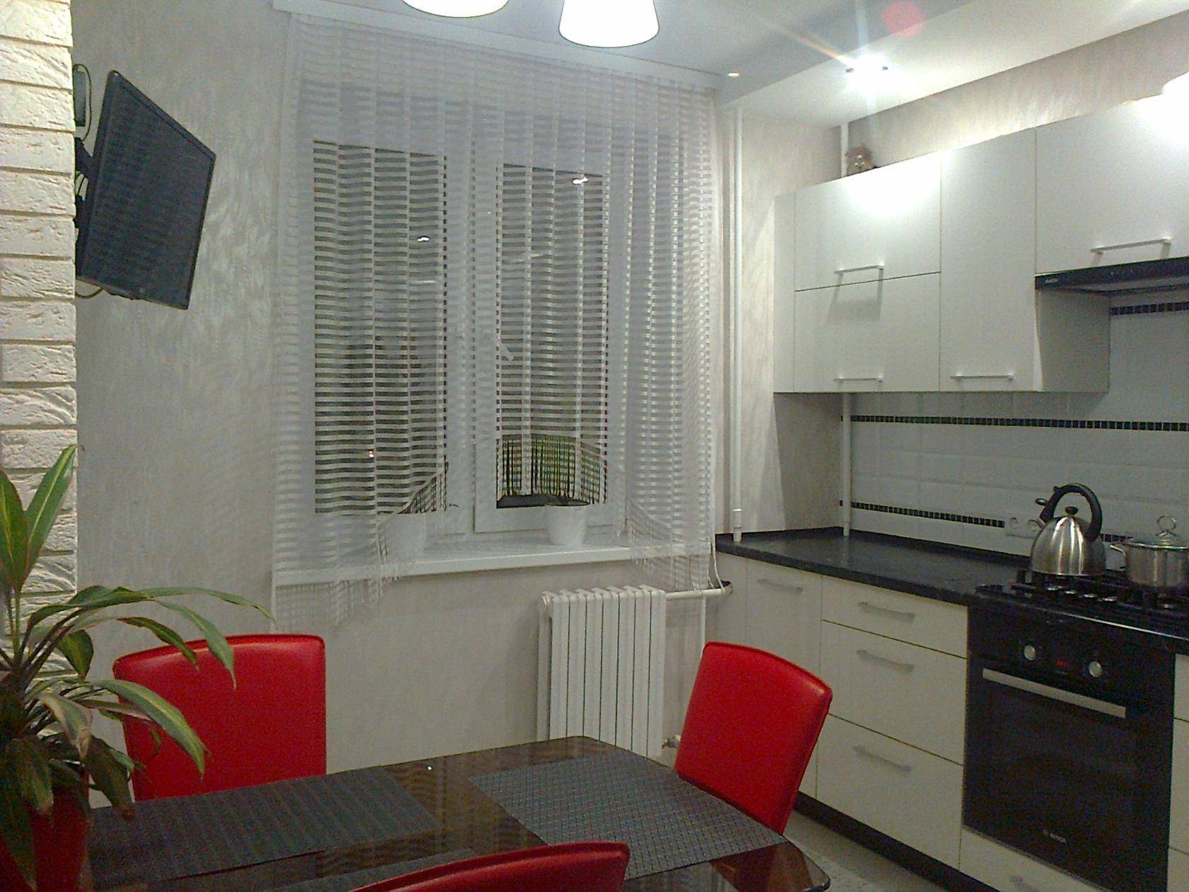 - При необходимости кухню украсят прямые занавески простого кроя.