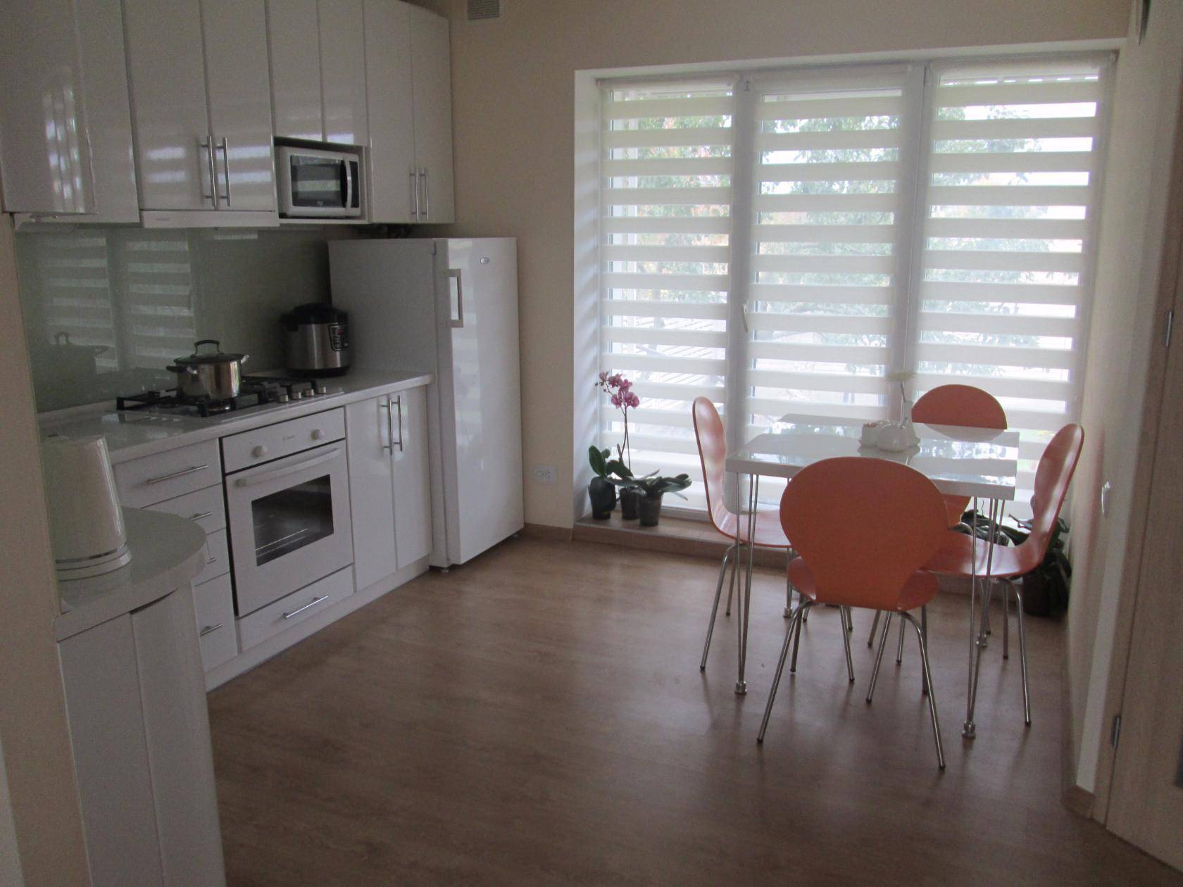 - Римские шторы или прямой крой подойдут для оформления интерьера кухни. Используются натуральные ткани.