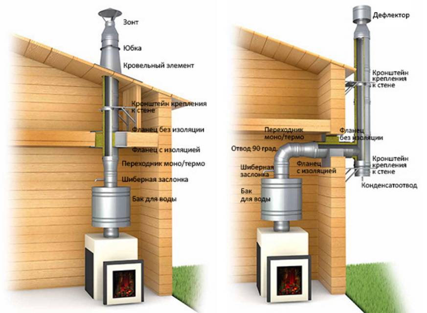 Существует два основных способа размещения дымоходной трубы по отношению к зданию:
