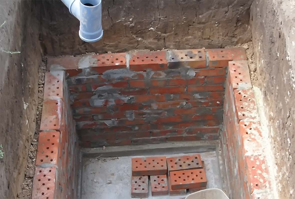 Кирпичная кладка имеет большое количество незащищённых мест в швах, где может оказаться недостаточное количество раствора. Поэтому, используя данный строительный материал для обустройства ямы дачного туалета, требуется оштукатурить стены выложенного колодца. Форма ямы делается округлой, но можно выбрать и прямоугольный или квадратный формат.