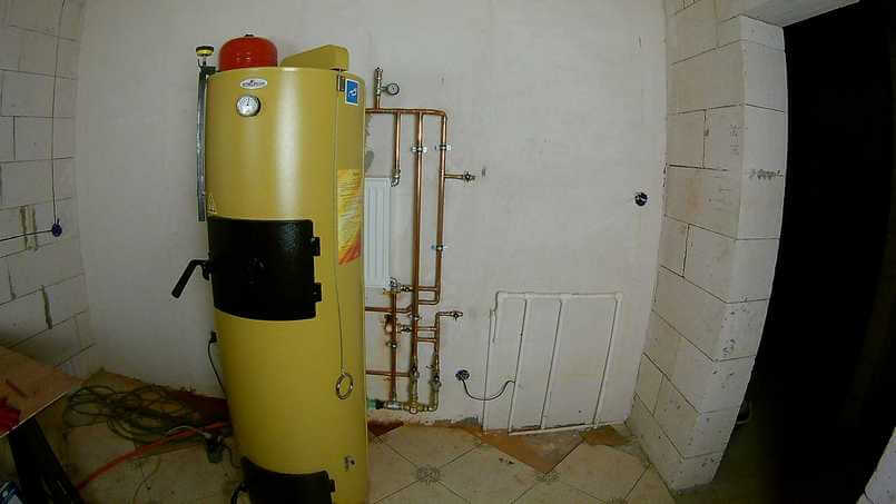 Заказчик выбрал дровяную версию котла Stropuva, мощностью 15 кВт. За котлом размещается радиатор охлаждения и обвязка котла, выполненная из меди.