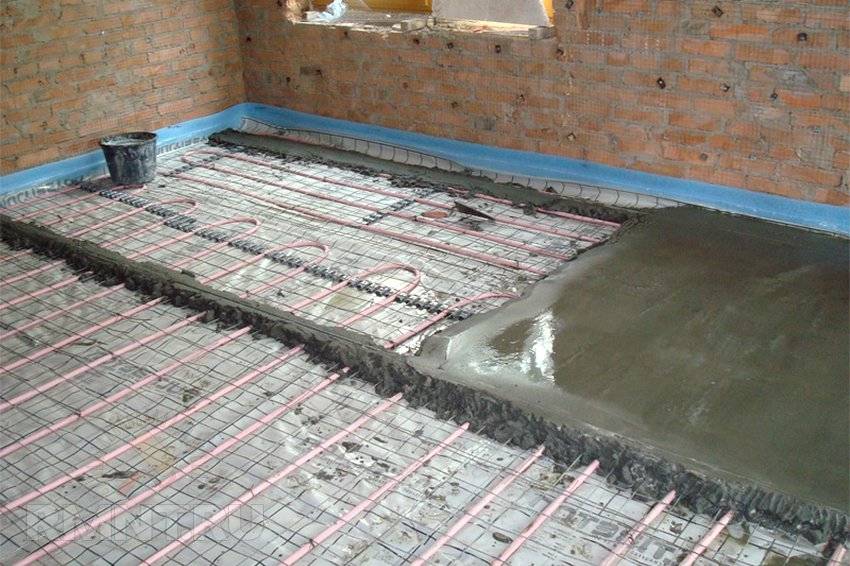 При ее устройстве следует учитывать, что из-за толщины бетонного слоя, необходимого, чтобы закрыть трубки, пол помещения может значительно подняться (на 10-15 см). Если потолки в комнате и без того низкие, лучше выбрать инфракрасный или кабельный вариант в тонкую (до 3 см) стяжку. Но в случае предпочтения заливки стяжки придется приготовиться к продолжительному и физически тяжелому ремонту: