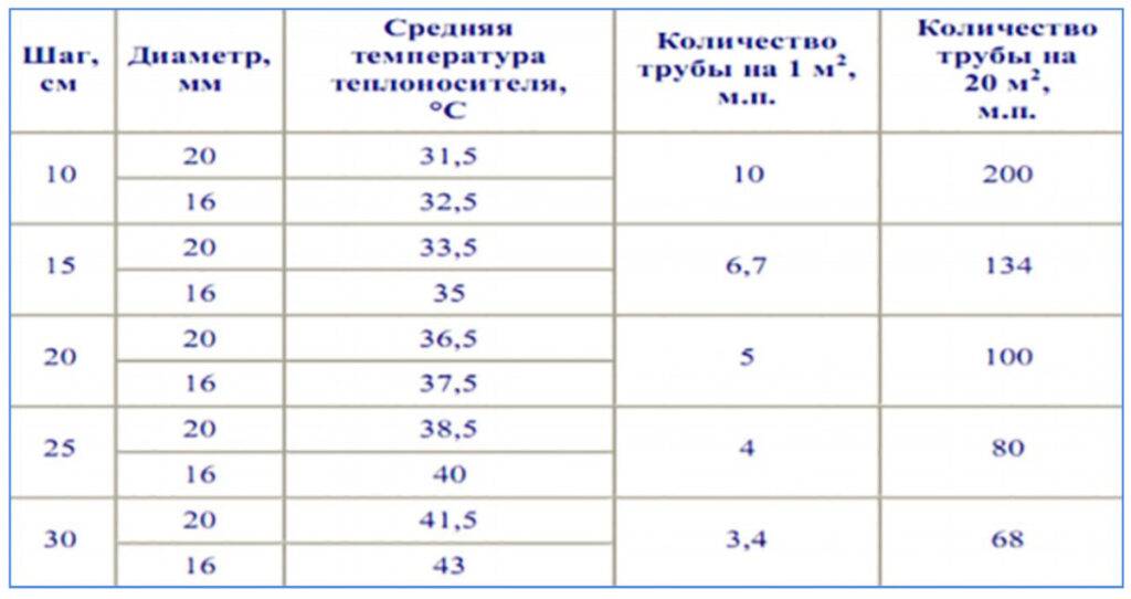 | Расчет трубы | Площадь помещения делится на размер шага трубы, умножается на коэффициент 1,1, затем к полученному значению прибавляется требуемая длина от коллектора до пола. |