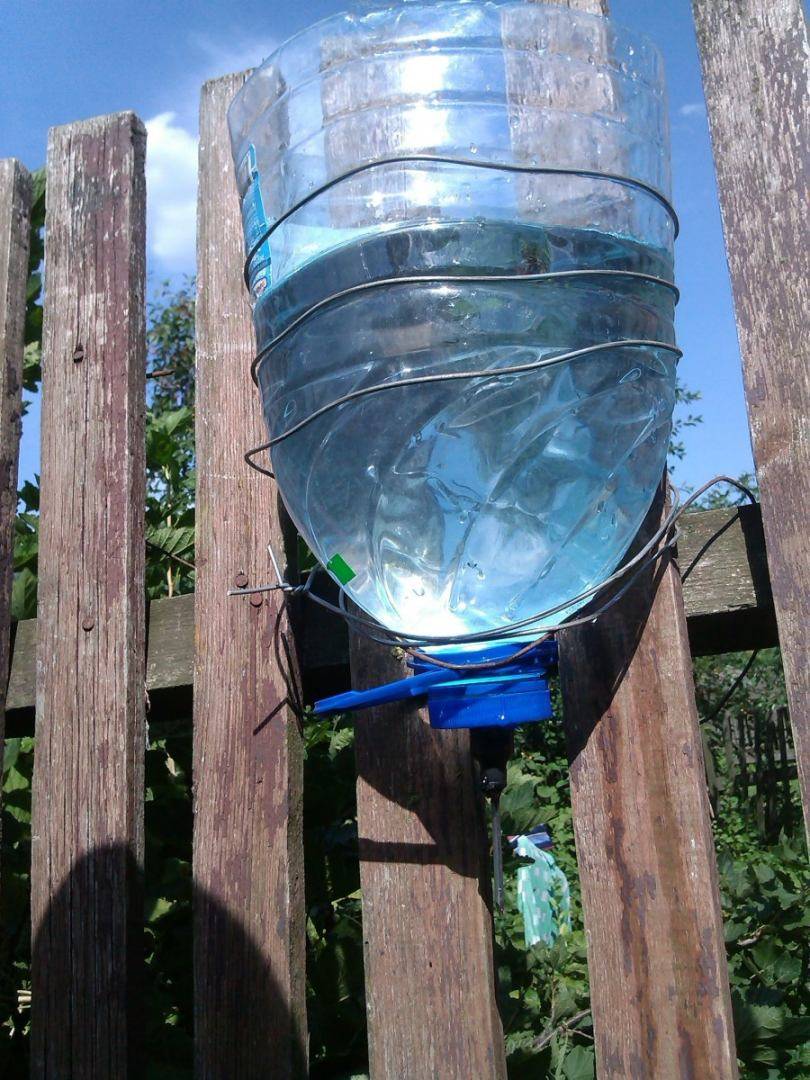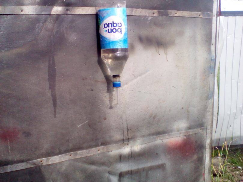 Минус конструкции в том, что вода льется непрерывно в перевернутом состоянии бутылки, быстро расходуясь, есть риск обратного перевертывания при сильном ветре.