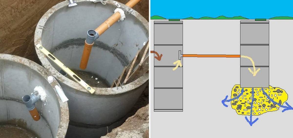 - Обычный сливной колодец с глухим дном и герметичной конструкцией. В нем будут собираться все отходы, твердые останутся на дне, а перелив в виде трубы будет подавать жидкую часть во вторую емкость.