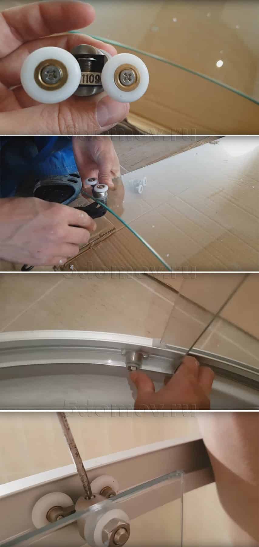 4. Переходим к навеске дверей из стекла на душевые уголки. Выполняя работу с элементами калёного стекла, будьте предельно аккуратным, потому что этот материал обладает хрупкостью. На все двери уголков в направляющие установите специальные ролики.