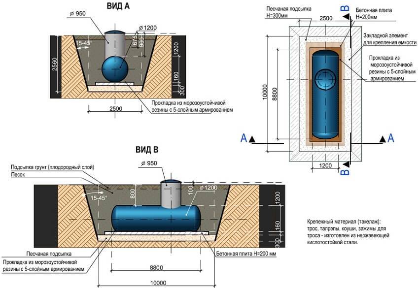 Глубина, на которую устанавливается подземный баллон, разнится в разных регионах – она зависит от глубины промерзания почвы. Однако в среднем − это 60 см. Такие модели, в свою очередь, тоже отличаются по объёму и типу.
