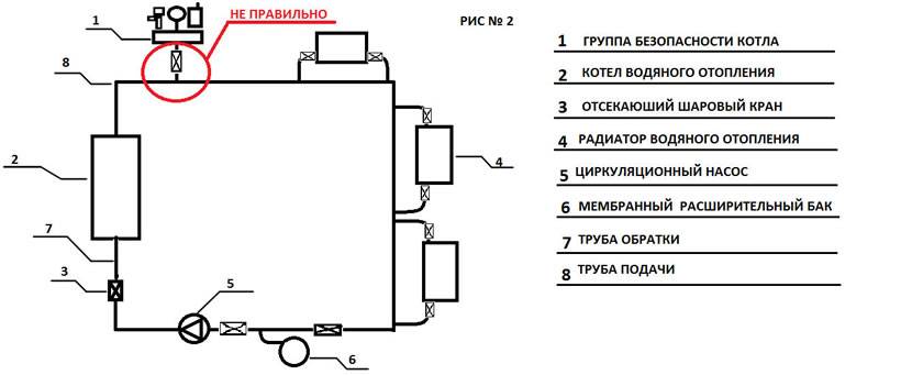 Устанавливается она на подачу. В силу незнания или неграмотности многие, устанавливая группу безопасности, ставят отсекающий кран между котлом и группой безопасности (рис.1),