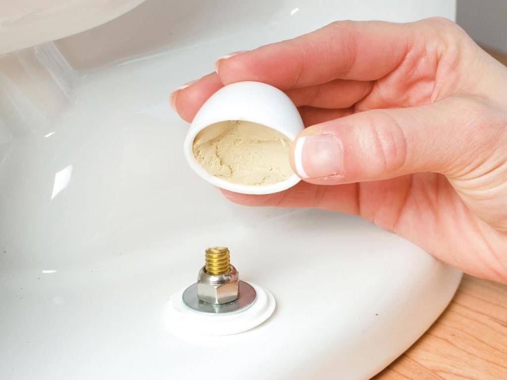 Четвертый шаг. Устанавливаем чашу. Вставляем крепежи через специальные уплотнительные прокладки. Затягиваем крепления. Слишком сильно тянуть не стоит – можно повредить либо крепления, либо даже сам унитаз. Тянем до обеспечения жесткого крепления сантехнического изделия к поверхности. Сверху закрываем крепежи заглушками.