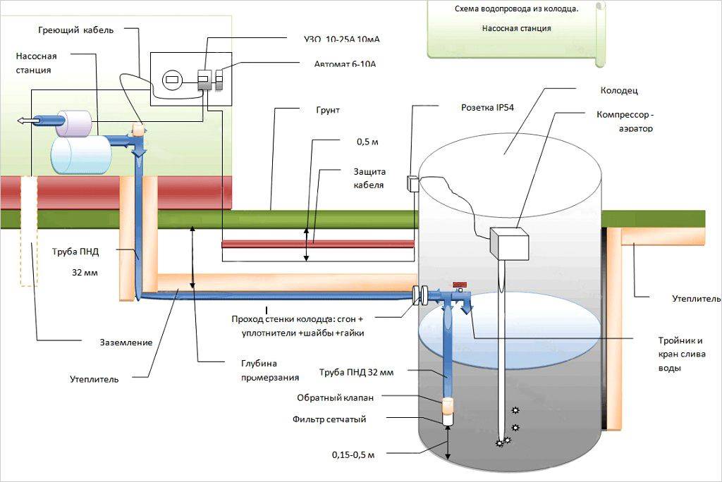 Устанавливается обратный клапан на насосную станцию, который предотвращает отток воды обратно в водоем. Когда насосная станция смонтирована в доме, всегда помним про удаление от питающего колодца. Если вода из колодца используется только летом, и вариантов подключения водопровода в доме не предусмотрено, подключать насосную станцию к колодцу можно по временной сезонной схеме. Запорной арматуры и дополнительных систем очистки воды на этом участке не нужно.