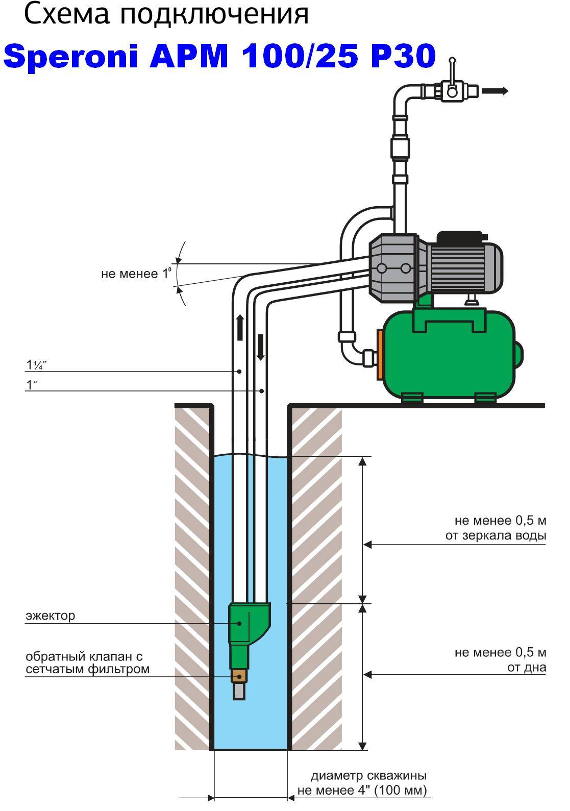 - Схема с использованием выдвижного эжектора характеризуется способностью обеспечивать подъем воды с глубины 50 м, при этом всасывающее устройство заглубляется в толщу воды. Учитывая низкий уровень шума, создаваемый при работе агрегата, существует возможность монтажа устройства в пределах дома. Такие аппараты хороши при большой глубине скважины, поскольку обеспечивают хороший напор при сравнительно малых затратах энергии. Однако, при всасывании часто происходит вовлечение в конструкцию частиц пыли и грязи, что приводит к засорению эжектора и его быстрой поломке. Производительность таких станций находится в прямой зависимости от глубины погружения аппарата.