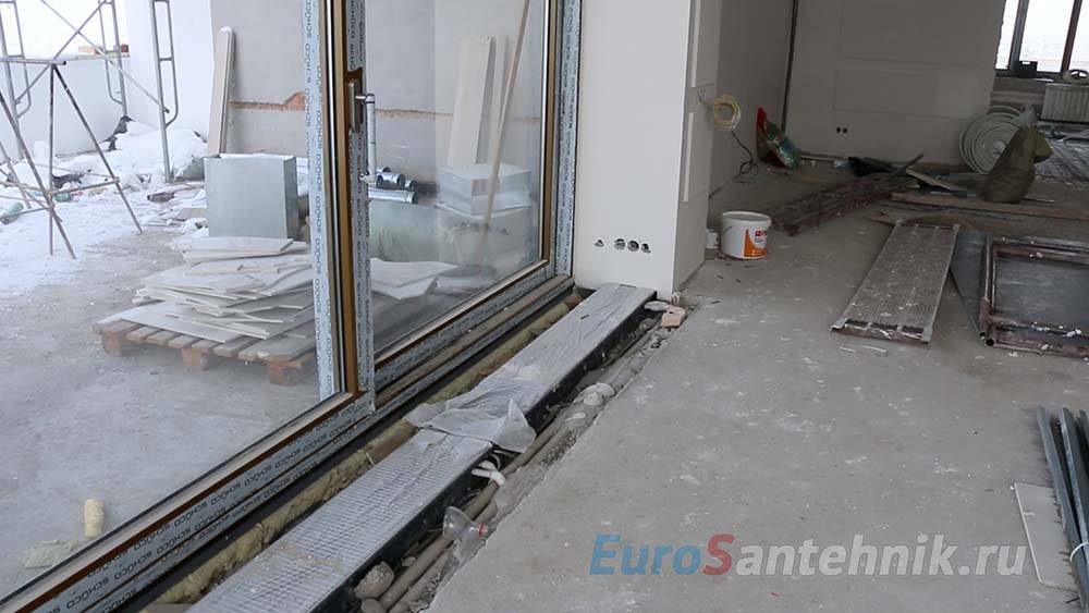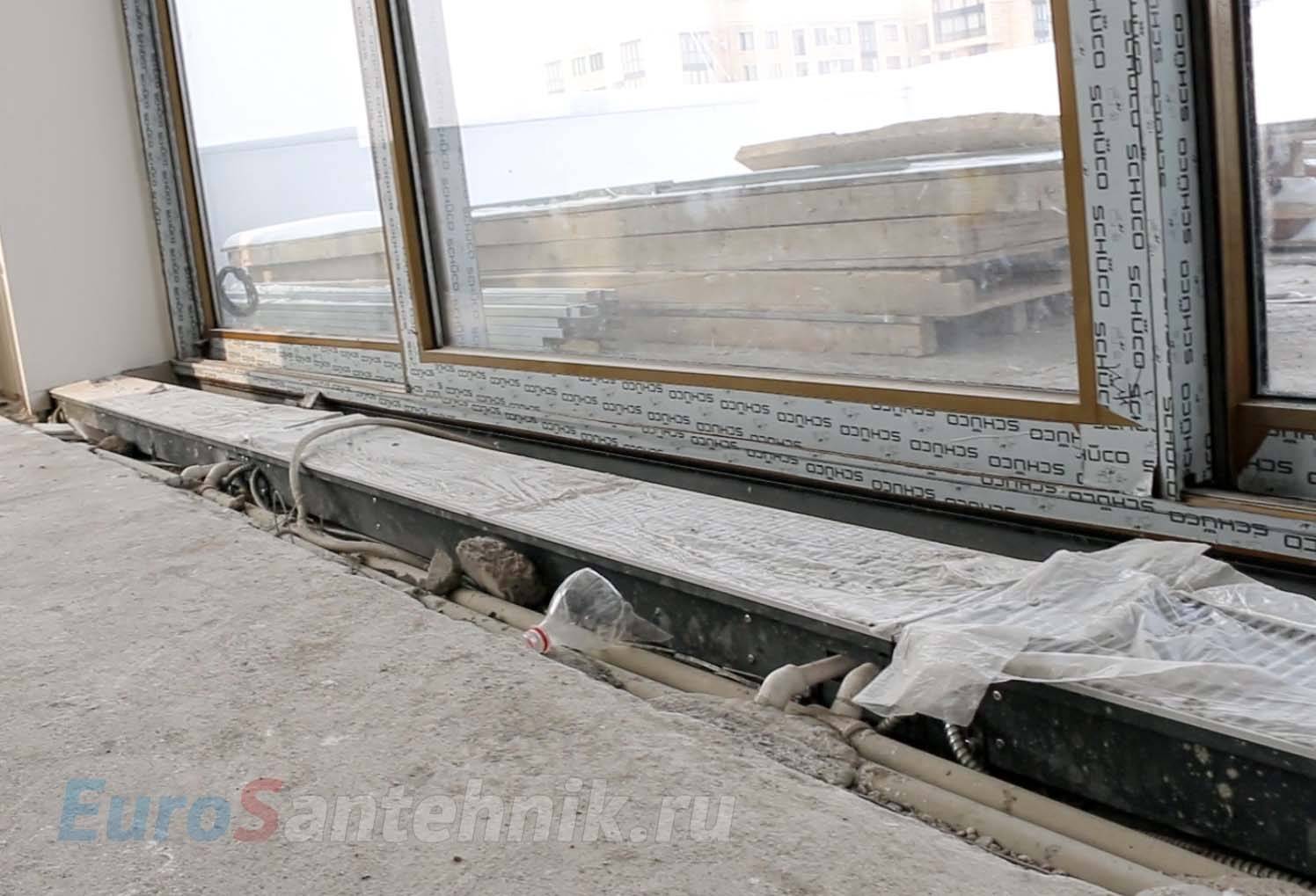 Соблюдая строительные нормы, подготавливается канал для установки конвектора внутрь пола. Чтобы не было потери тепла гидроизоляцию канала делают такой же, как и во всём здании. Возможно, понадобится монтажная слабо расширяющаяся пена, чтобы заполнить пространство между стенкой конвектора и каналом. Это проделывается по причине нежелательных нагрузок на боковые стенки устройства.