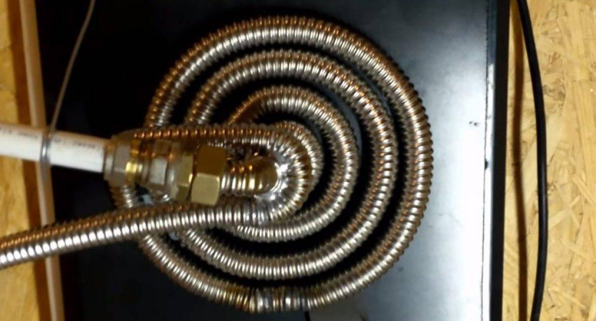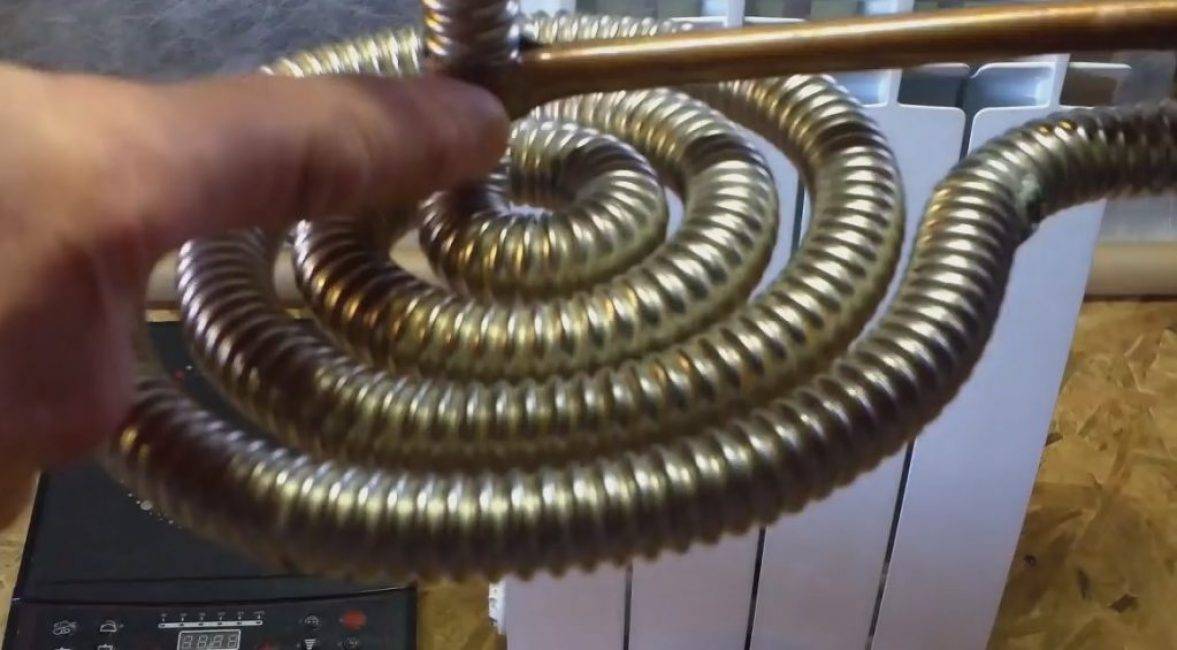 Котёл отопления – ёмкость, где будет происходить нагрев теплоносителя, т.е. воды. Для его изготовления из гофрированного металлического шланга формируем спираль, как показано на рис.2. Для этого понадобится около 1 метра. Формировать спираль нужно таким образом, чтобы оставшихся концов шланга хватало для подключения к алюминиевому радиатору.