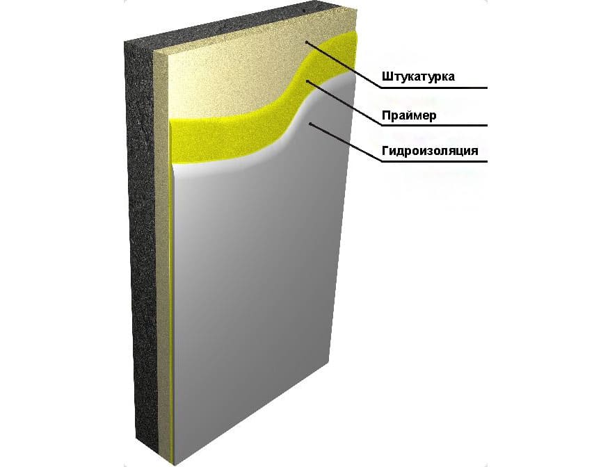 Если для стены будет применяться другой вид гидроизоляции, то её желательно заранее выровнять стартовой или универсальной штукатуркой. После чего проводится обмазочная гидроизоляция тем же способом или гладким шпателем.