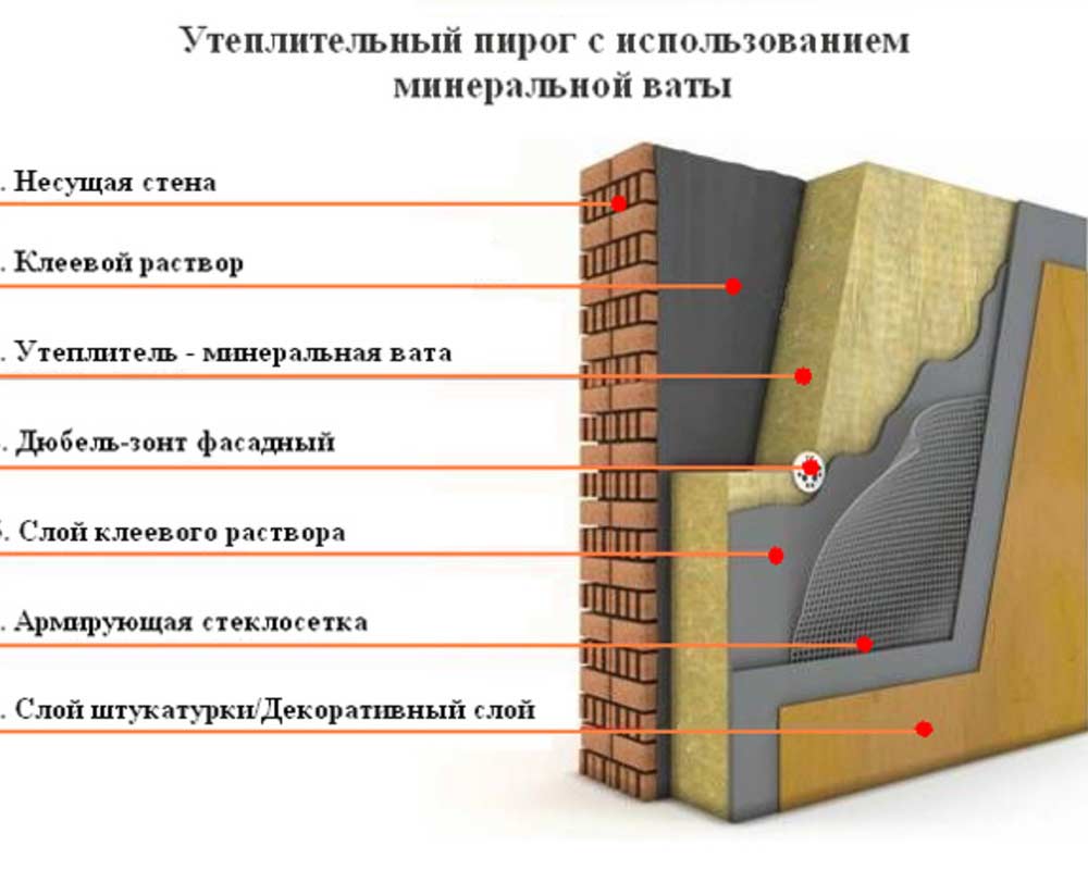 Способ утеплить фасад минеральными плитами имеет ряд кардинальных отличий и именуется в среде профессионалов «мокрым способом». Этот метод не подразумевает утепление деревянных домов. Последовательность выполнения работ такова: