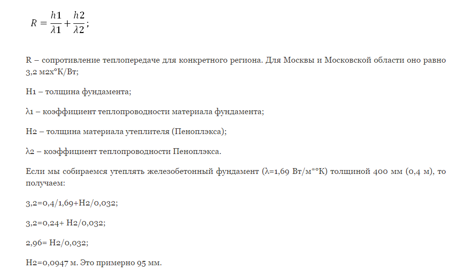 У каждого региона России, есть свой конкретный показатель сопротивлению теплопередаче, который при необходимости можно найти в интернете. Приведем пример расчета необходимой толщины плит, для Московской области, для этого воспользуемся следующей формулой: