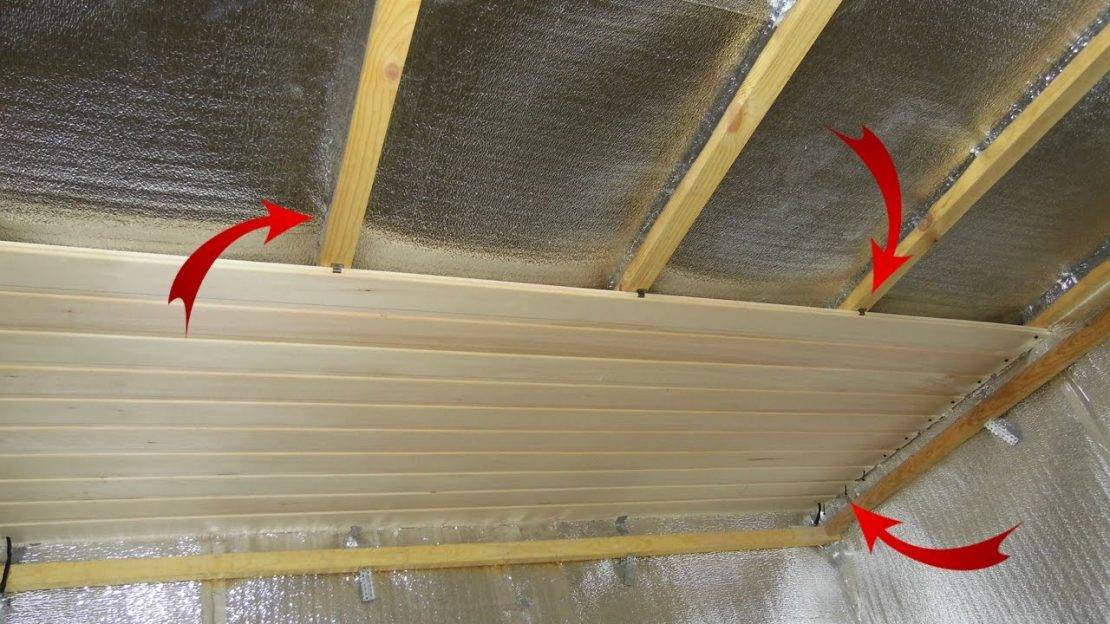 Для укладки изоляции потребуется смонтировать обрешетку, внутрь которой и будут вставляться куски утеплителя. Стыки отдельных полос проклеивают металлизированным скотчем. После монтажа утеплителя, поверх него крепят контробрешетку, на которую уже фиксируют финишную отделку. Зазор между утеплителем и вагонкой нужен для создания вентиляции.