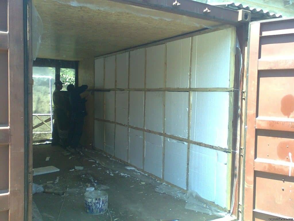 - Пол, стены и потолок контейнера обшиваются листовым пенопластом с применением «жидких гвоздей».