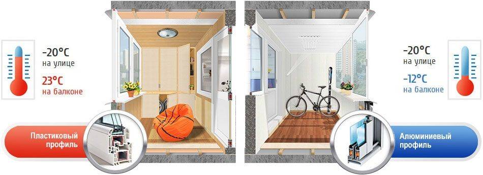 Профиль может быть изготовлен из пластика или алюминия. Он служит каркасом. Так как плита основания не предполагает высокой нагрузки, предпочтительнее выбирать теплый алюминиевый профиль – весит он меньше. Также металлический профиль предполагает раздвижную систему открывания, что особенно актуально для маленького по площади балкона.