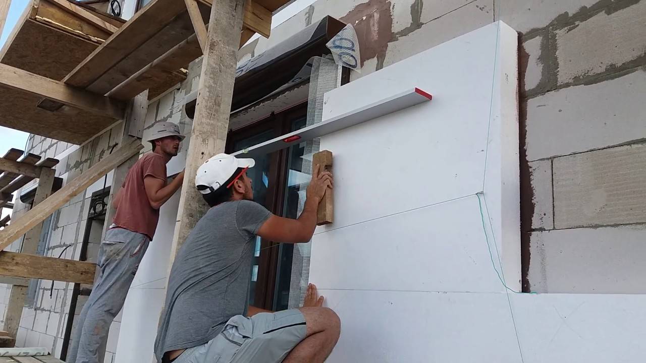 Для этого используются агрессивные моющие вещества, жесткая щетка и металлическая губка;Неровности, возникающие с течением времени или вследствие заводского брака, стоит выровнять;Возле окон требуется наклеить стекловолоконную сетку. Крепится она таким образом, чтобы под крайним слоем утеплителя находилось не менее 10 сантиметров сетки, а также была возможность приклеить поверх него еще около 10 сантиметров. Эта процедура выполняется для дополнительного армирования;Специальный клей наносят на лист пенопласта (специалисты рекомендуют использование зубчатого шпателя для равномерности нанесения и покрытия всей поверхности пенопласта);Дополнительная фиксация обеспечивается использованием пластиковых дюбелей;К оштукатуриванию и покраске утеплительного материала рекомендуется приступать после того, как высохнет клей.