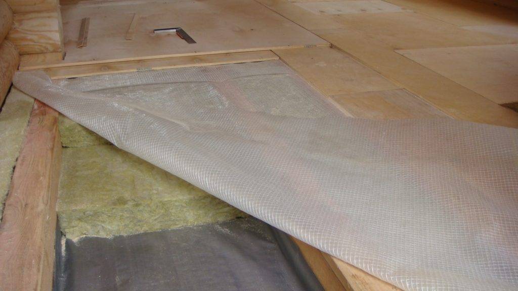 После укладки утеплителя, его закрывают пароизоляционной мембранной. Обычно, этот материал крепится к стропилам скобами с помощью степлера. Полотна укладывают поперек стропил с нахлестом 10-15 см, скрепляя их между собой скотчем.