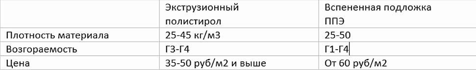 Таблица сравнения подложки из пенополистирола и вспененной из сшитых пен (ППЭ) 2-3 мм: