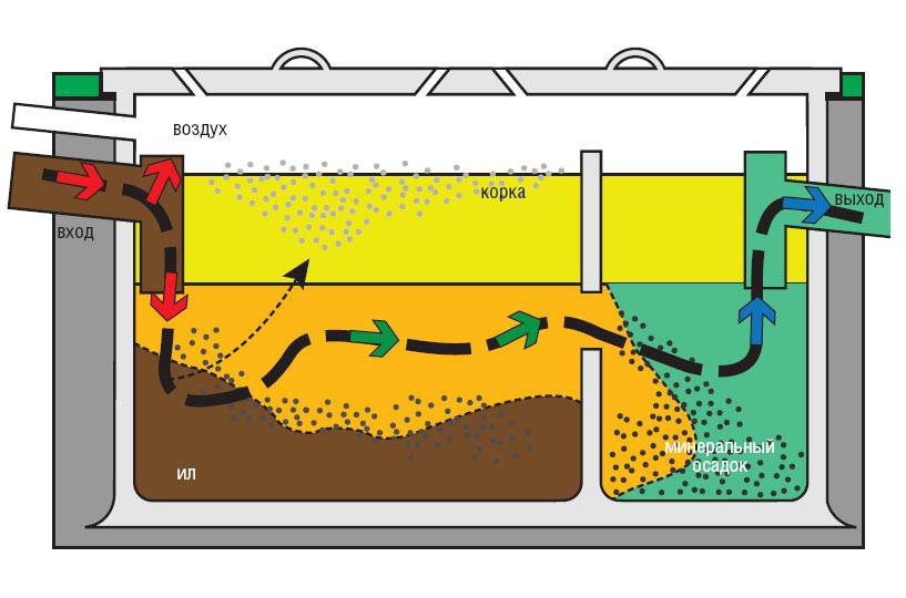 Работа септика практически происходит по-разному в каждом случае. Осветленная в процессе прохождения септика вода должна уходить постоянно, ведь септик пополняется также постоянно. На деле часто происходит несколько другой процесс — септик работает до тех пор, пока вода заполняет емкость. Такое часто происходит при непонимании того факта, что одного септика для успешной работы канализации недостаточно. Должен быть обеспечен отвод осветленных стоков, должна работать вентиляция септика. Предполагается, что при использовании дорогого импортного септика с аэрацией можно сбрасывать стоки в ближайшие водоемы.