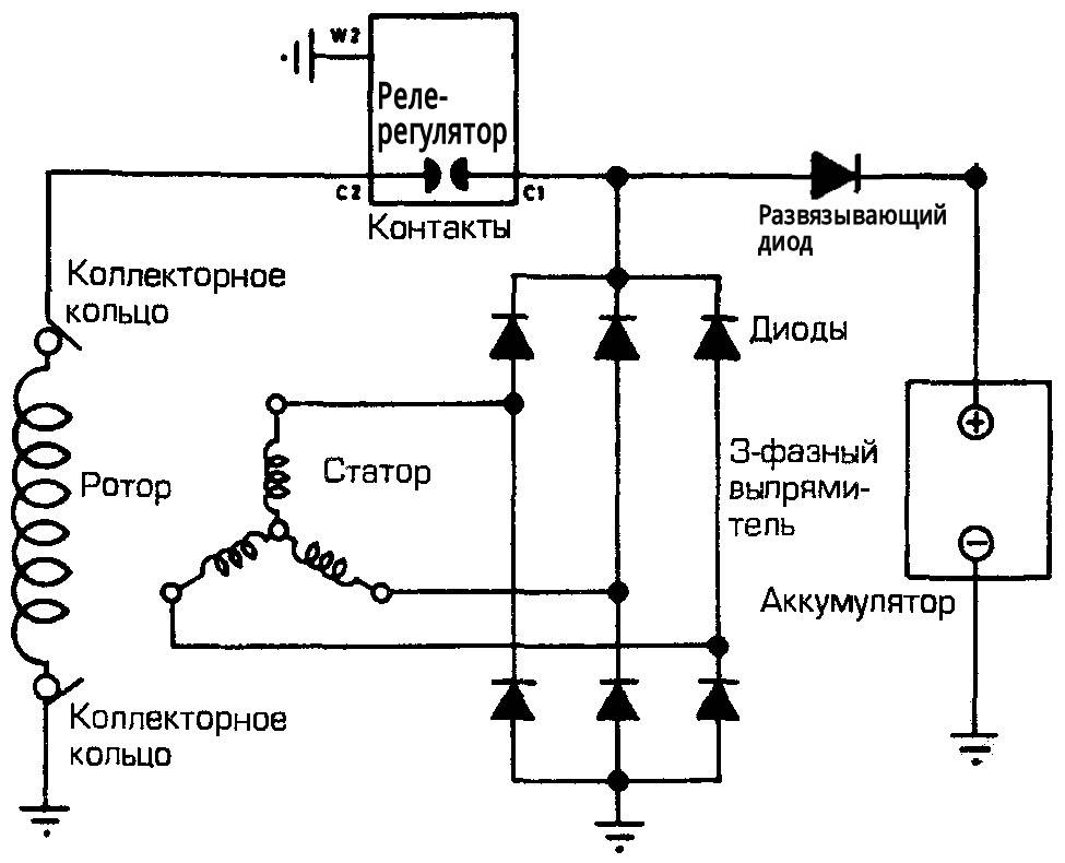 Так-же можно использовать так-называемую таблетку, то-есть реле-регулятор как в автомобиле, который будет отключать возбуждение если напряжение АКБ достигло14.2 вольта, чтобы не перезарядить. Ниже на рисунке схема самовозбуждения генератора. Вообще генератор сам возбуждается так-как ротор имеет остаточную намагниченность, но это происходит на высоких оборотах, лучше для надёжности добавить магниты. В схему включен реле-регулятор, но его можно исключить. Развязывающий диод нужен чтобы аккумулятор не разряжался так-как без диода ток будет течь в обмотку возбуждения (ротор).