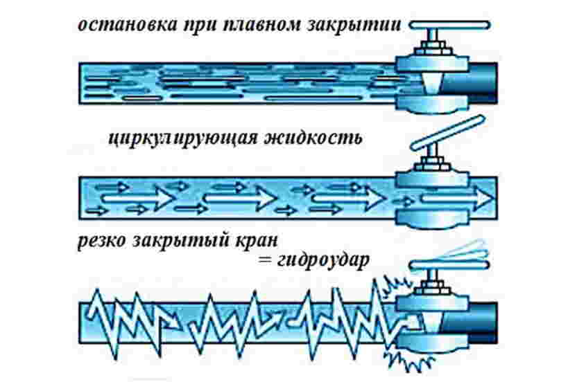В основном, гидроудар происходит при резком закрытии запорной арматуры. Вода проходит по трубам с постоянным давлением, но когда происходит резкое перекрытие водного потока. Давление воды на стенки труб увеличивается в несколько раз.
